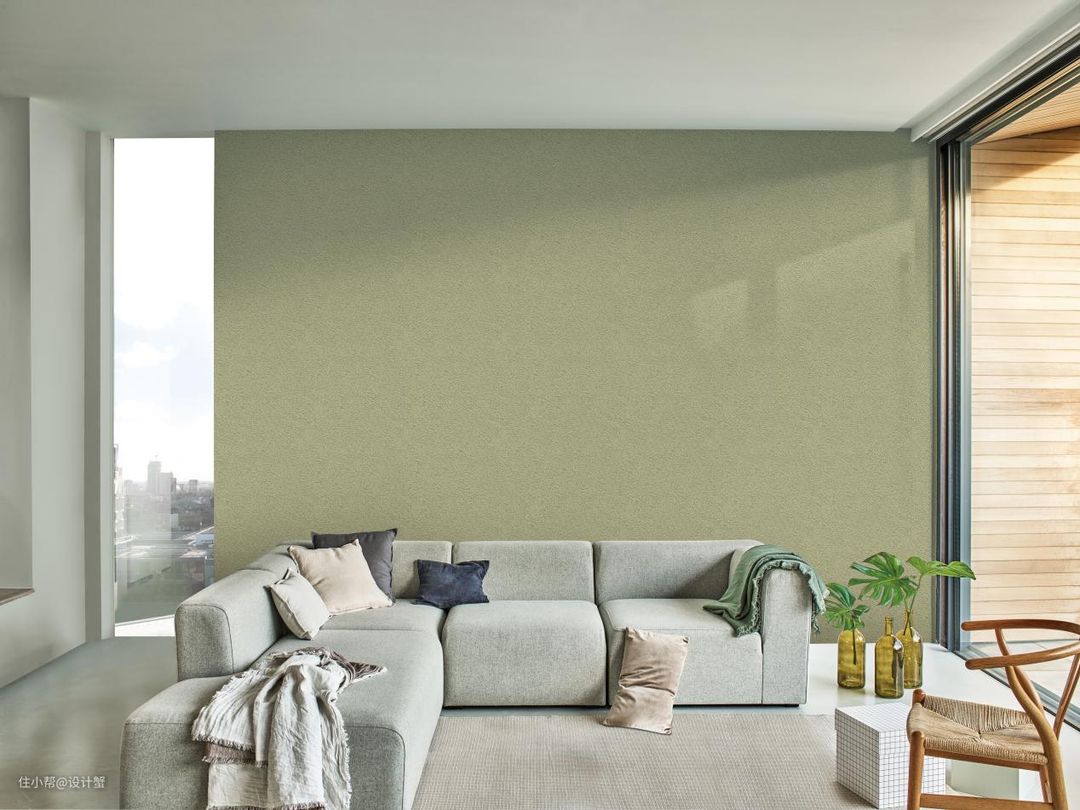 运用多乐士艺术漆雅晶石质感YJ-164院子青苔涂刷沙发背景墙,素雅朴实的绿色彩调配浅灰布艺沙发,让空间饱满而赋有层次感。